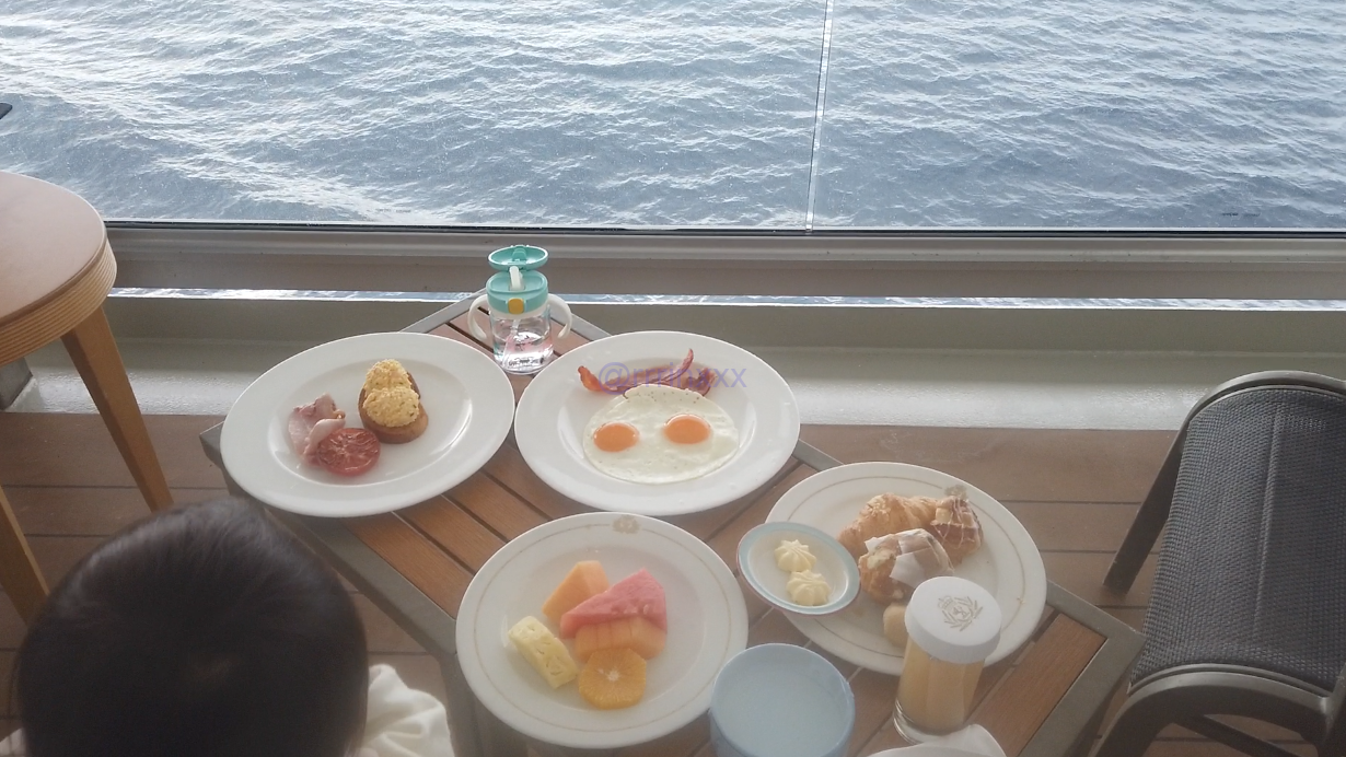 バルコニーから水平線を眺めながらの朝食は、やはり最高の贅沢。バルコニーを隣室と繋げてもらったので、さらに広く使え、娘も楽しそうに走り回っていました。
