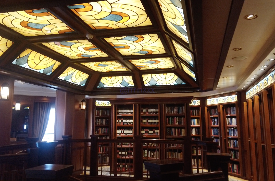 その後は3階の図書室へ。重厚感のある空間で、クイーンエリザベスらしい雰囲気を体感。蔵書は英語中心ですが、静かなひと時を楽しみました。