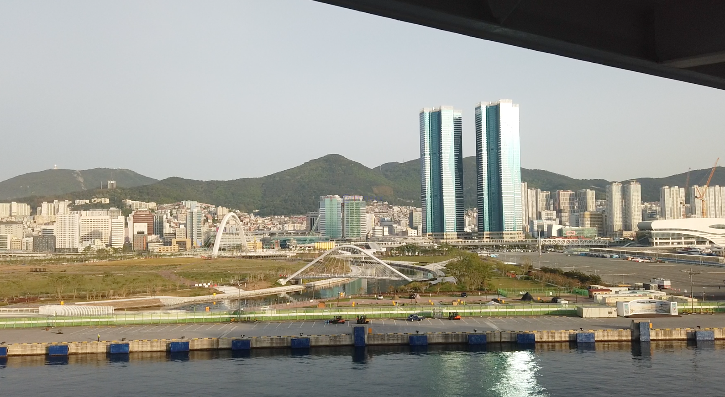 朝目を覚ますと、船は韓国・釜山に入港しようとしていました。近づいてくる街は高層ビルが立ち並び、想像以上の大都会ぶりにびっくり。