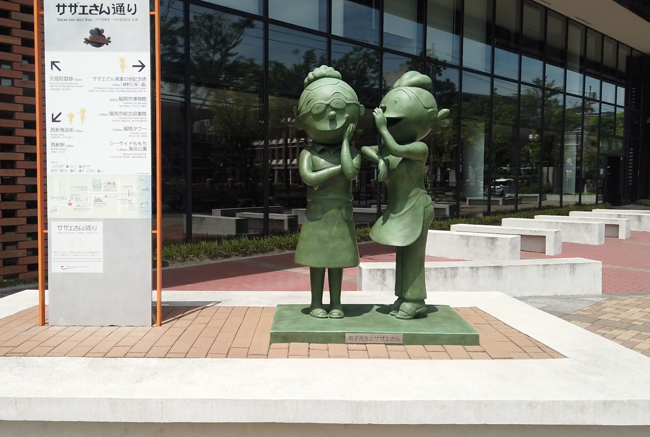 福岡市博物館最寄りの「西新」駅から徒歩15分。途中「サザエさん通り」があり、作者・長谷川町子さんが構想を練った地として、サザエさん像が並んでいました。記念撮影も。