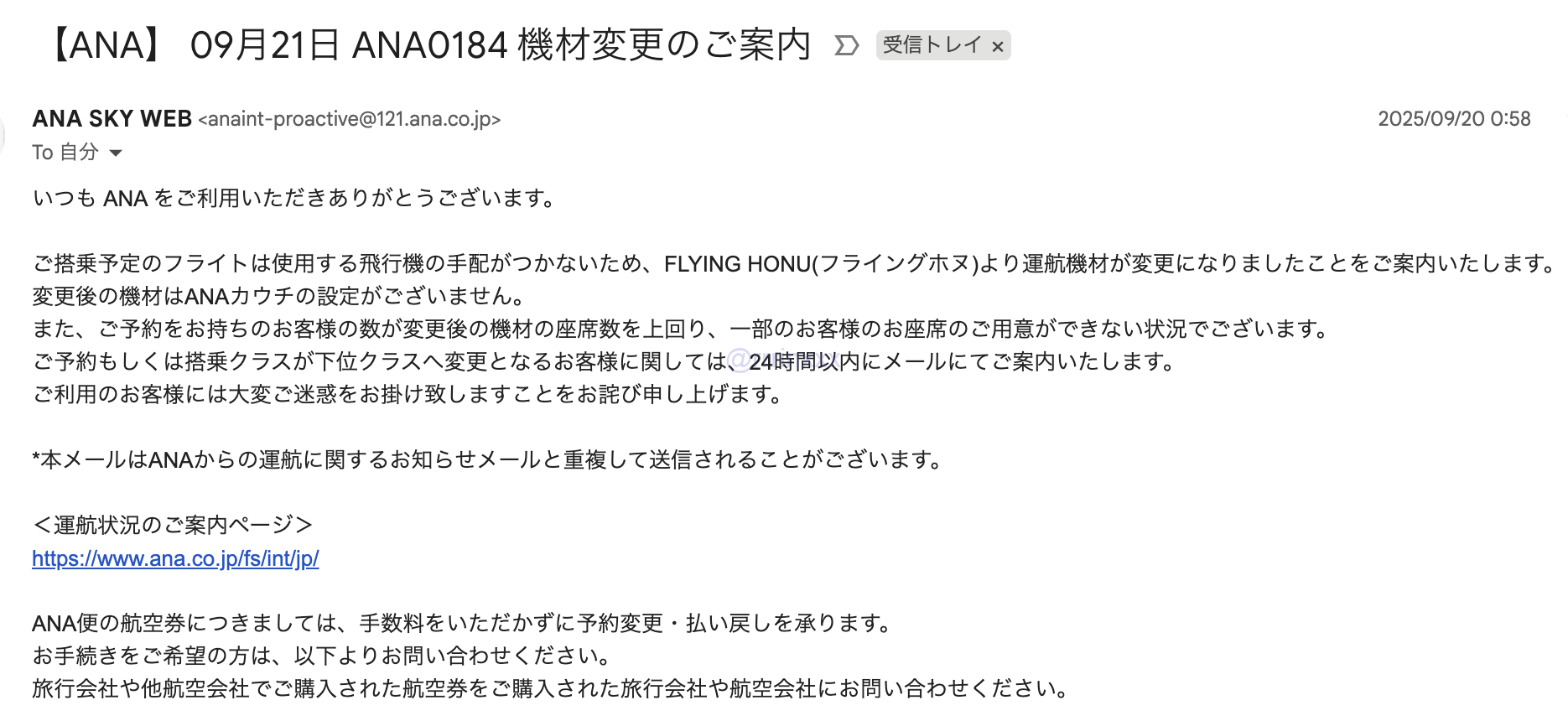 実は、このメールが届く少し前から「どうもHONUの1機が整備で使用できないかもしれないらしい」という話をXやFacebook上でキャッチしていました。