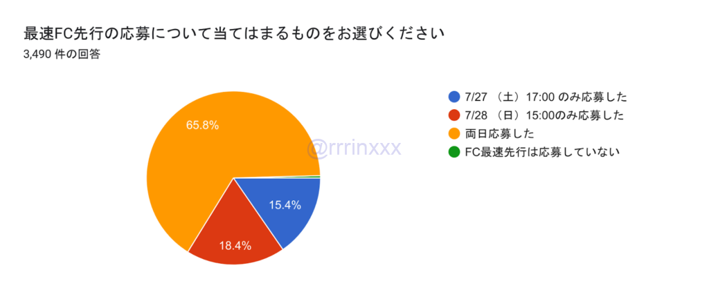 FC先行に申し込む方は約6割、そのうち半数ほどは両日申し込み、単日申し込む方は7/28申し込み予定の方が若干多い傾向です。