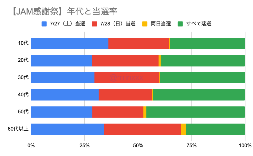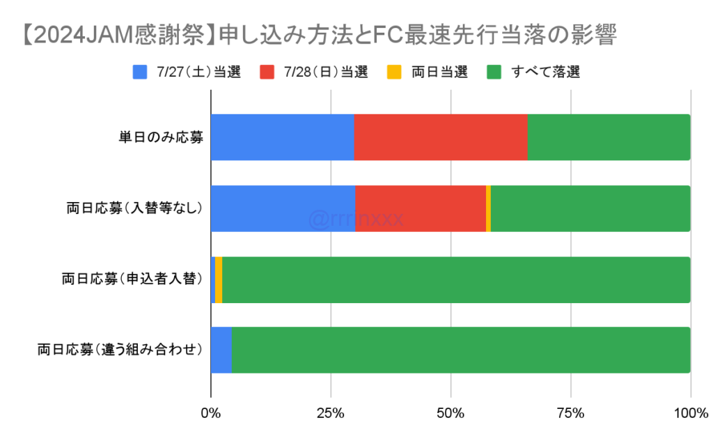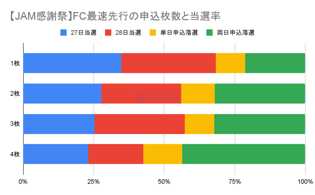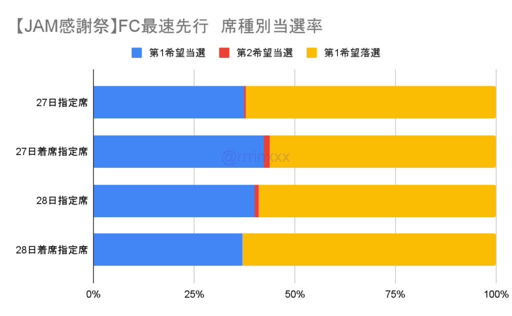 最速先行の当選率はおよそ6割となり、土日2公演での当選率は大きな差はありませんでした。両日当選は複数報告ありましたが1%未満で、レアケースと捉えております。