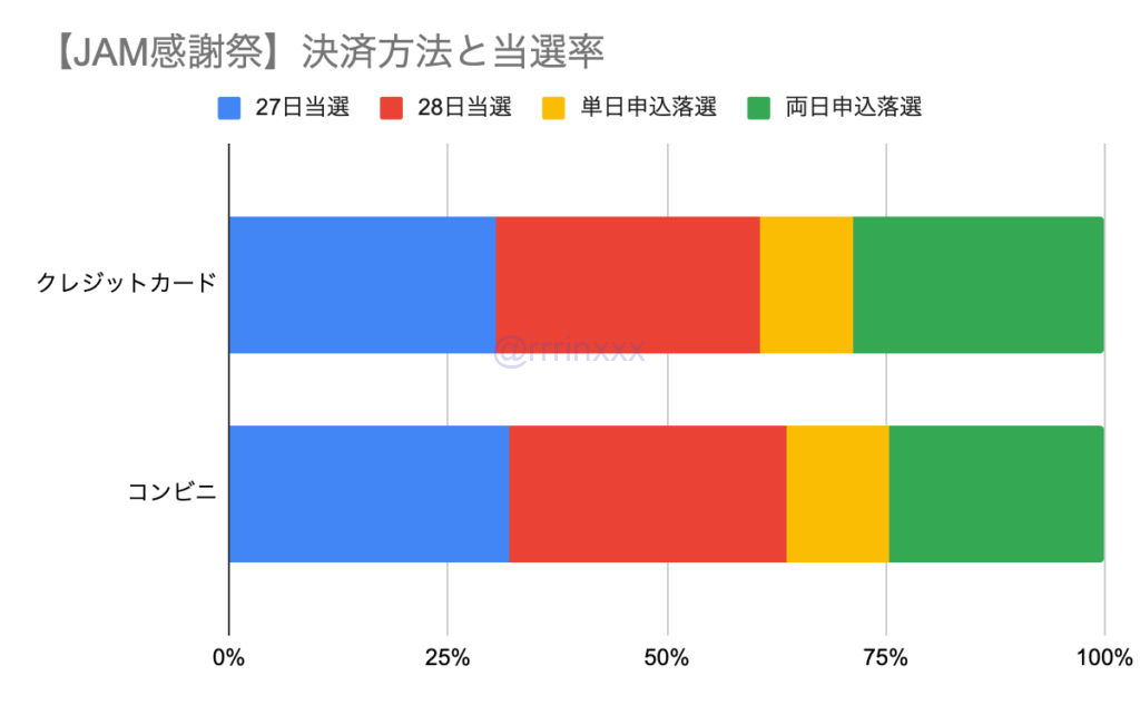 クレジットカードとコンビニ払いの間に当選率の差はほぼなく、決済方法は影響していないと考えます。