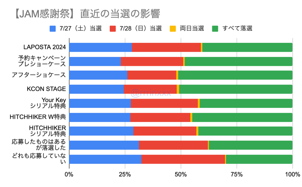 落選・未応募者がやや当選率高く、予約キャンペーン・アフターショーケース・KCON STAGEなどの当選者がやや当選率低い影響。