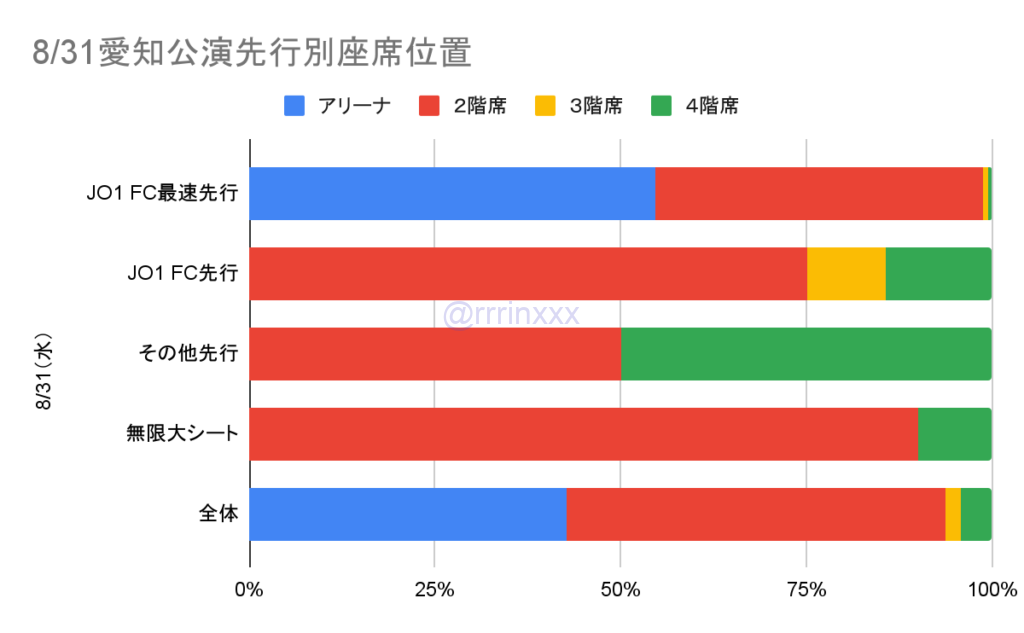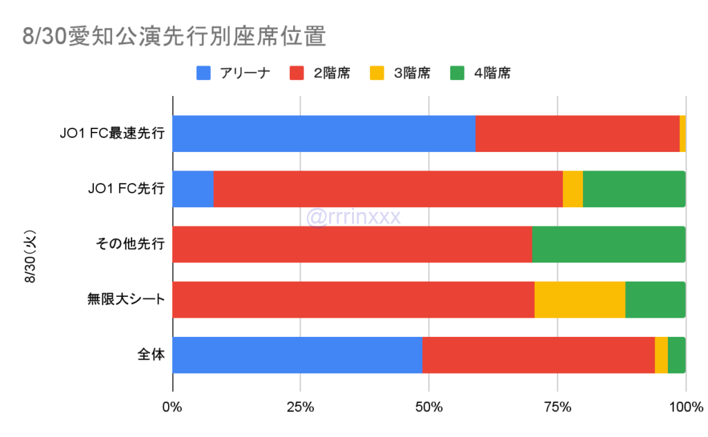 愛知公演は公演間で大きく違いはなく、最速先行の6割ほどがアリーナ、一部を除き、その他先行・一般は2階席以上となりました。