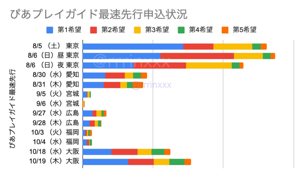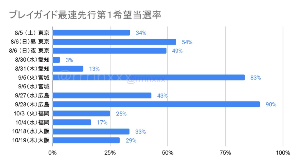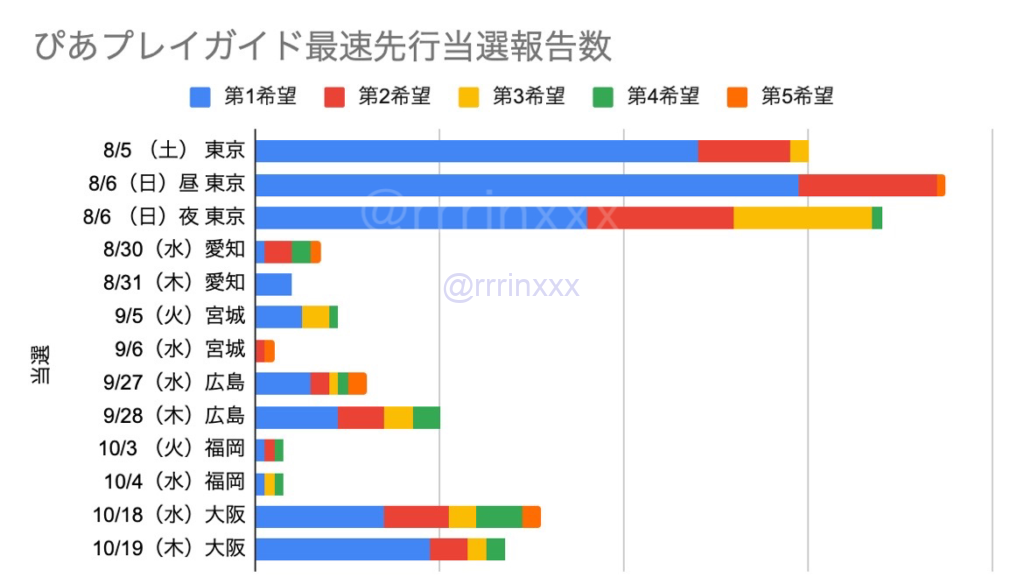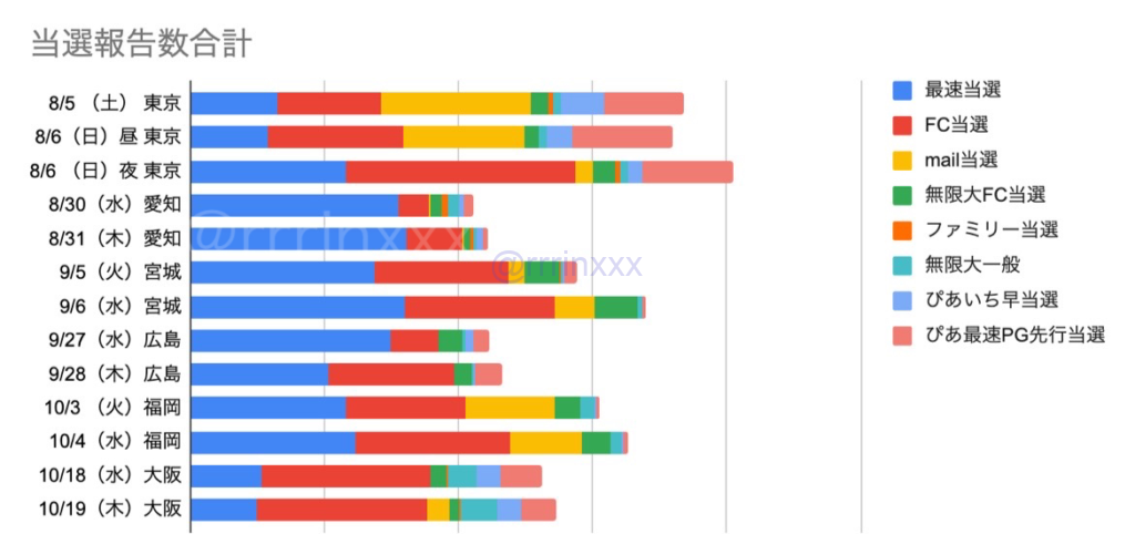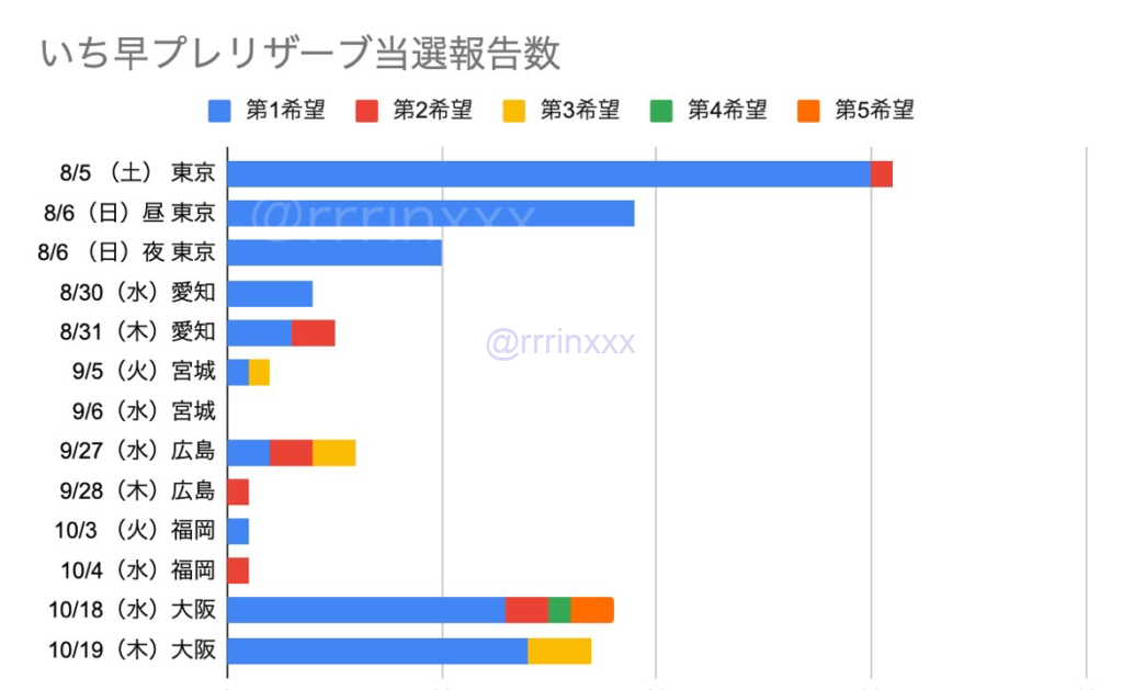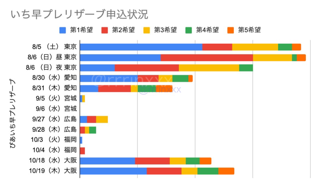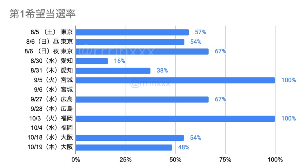 ・開催地別では、東京→大阪→愛知→広島→宮城・福岡の順で、宮城・福岡は特に既にチケット当選者が多いためか希望報告極少