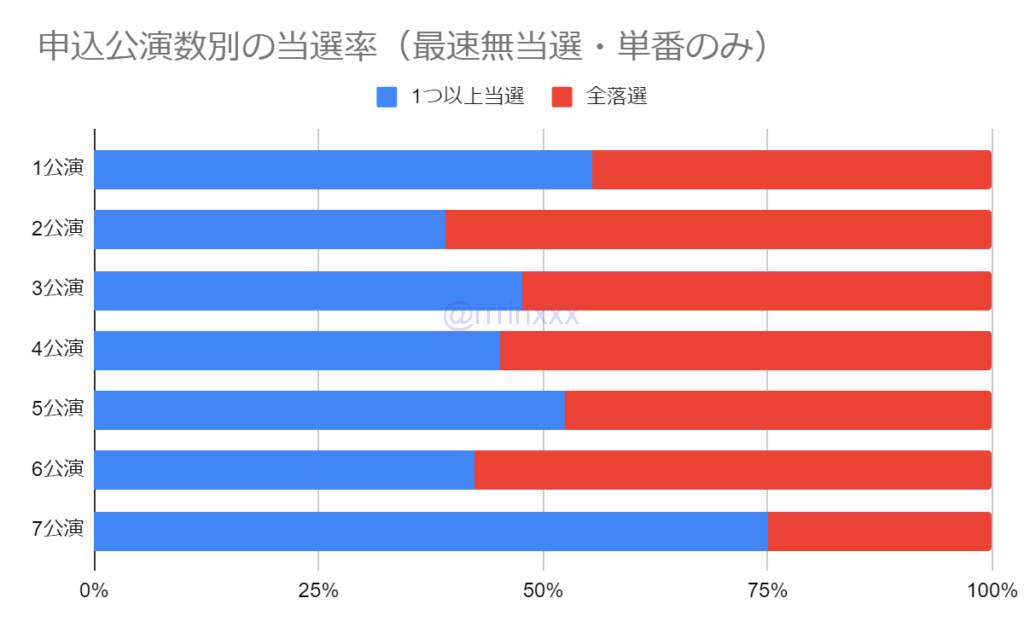 連番の場合は同行者が別公演で当選している場合等もあるので、「全公演単番」のみで絞った結果が下記です(8公演以上申込は少ないので省略しています)。1公演のみ申込の場合の当選率がやや高めです。