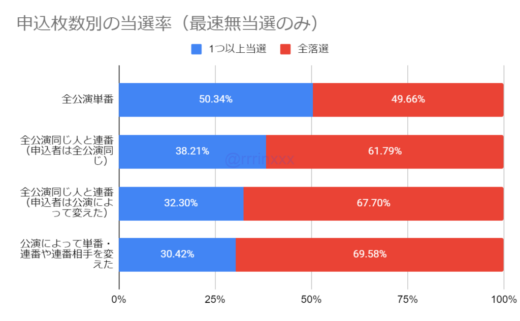 2公演以上申し込んでいる場合は「全公演単番」の方が「全公演同じ人と連番」よりも明らかに当選率が高い結果でした。
