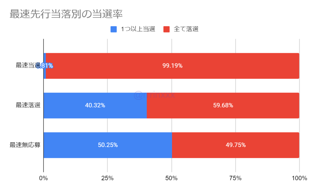 全体の93%が第1希望を「指定席」としているため参考までですが、第1希望を指定席にしている場合の最速無当選の方に絞った当選率は40%、第1希望を着席指定席としている場合は53%でした。