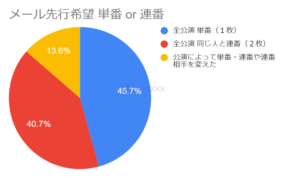 なお、今回「全公演同じ人と連番」でも、連番相手の最速先行での当落や、連番相手がFC先行内で他に申し込みしているかどうかは設問として用意していなかったため、「全公演同じ人と連番(同行者側も最速無当選かつFC先行内で単番申込や別の連番相手との連番申込をしない)」場合でも「全公演単番」より当選率が下がるのかは不明です。