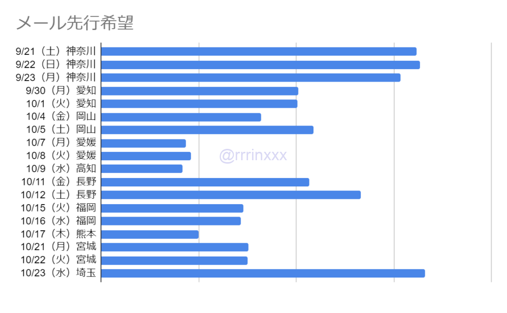 メール先行では埼玉の希望が最多に。キャパを考慮すると、引き続き岡山、長野、埼玉の倍率が高い(特に土曜日公演)。