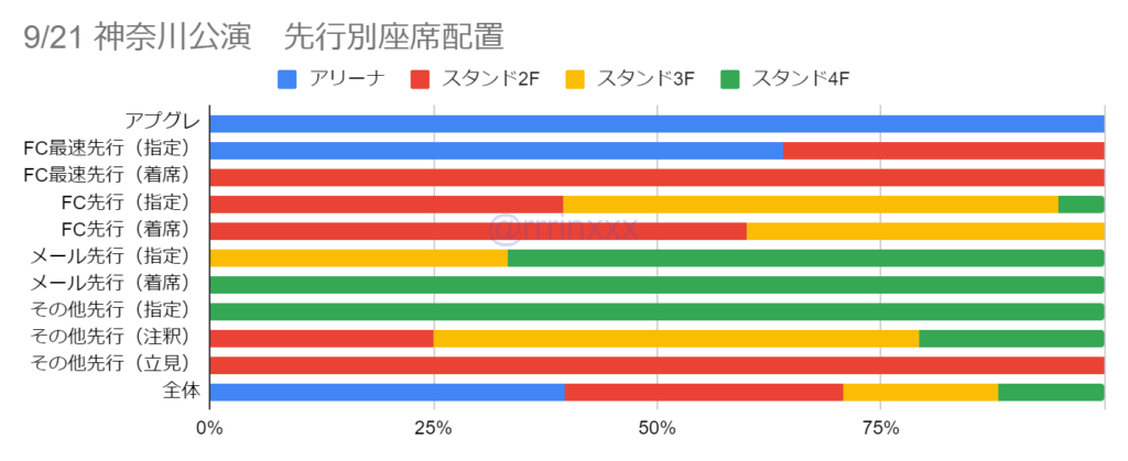 基本的にはステージに近いブロックかどうかによらず、早い先行ほど下の階かつ前列でした。