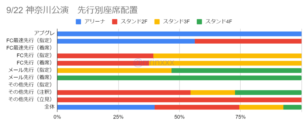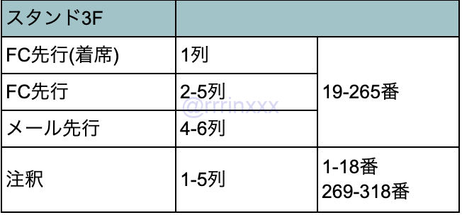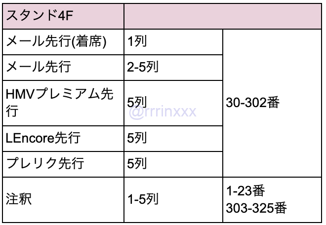 ・スタンド4Fはほとんどメール先行で、その後ろにローチケ先行(LEncore先行、HMVプレミアム先行、プレリク先行)が並ぶ形。ローチケ先行の指定席枠はかなり少なかったようです。
