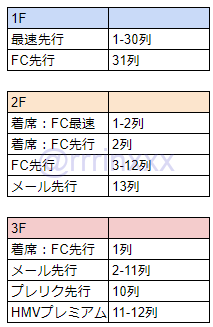 プレリク先行がHMVプレミアム先行よりも前列となっていますが、プレリク先行の回答は1件のみであったため、参考程度としてください。