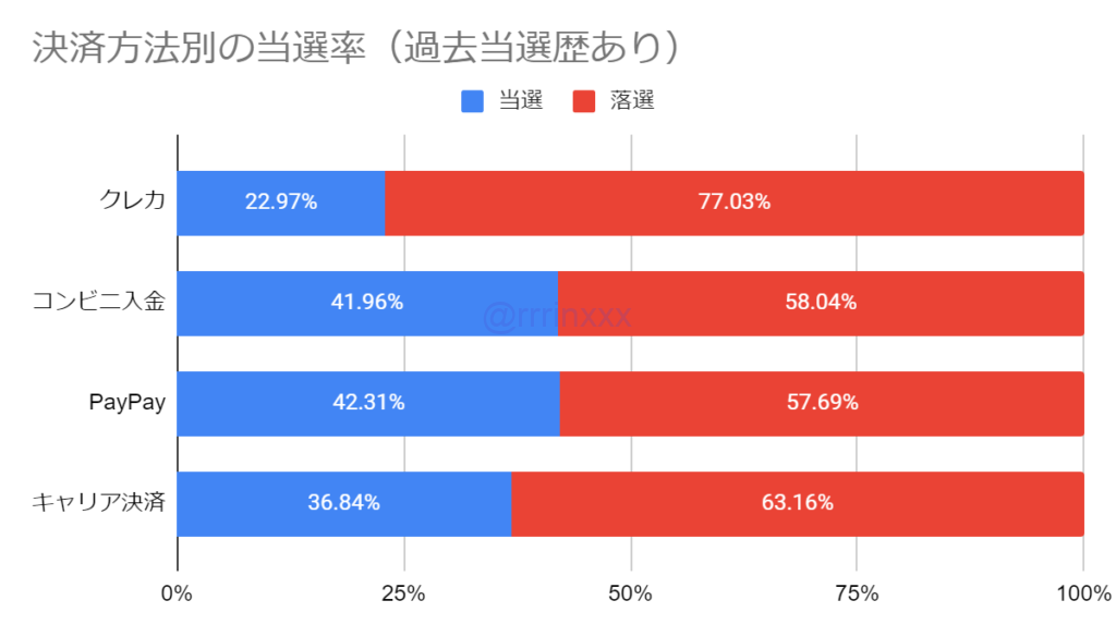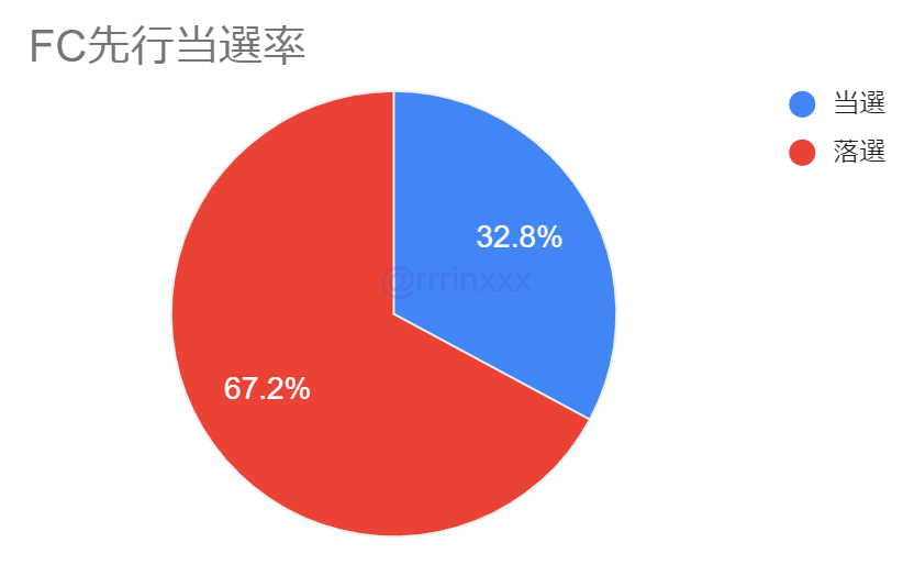過去の先行では決済方法は過去の当落結果にかかわらず影響ありませんでしたが、今回のFC先行ではクレカ利用時の当選率が低い結果となりました。