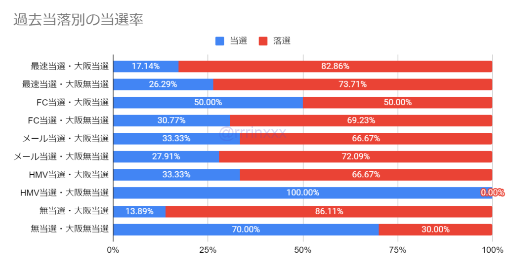 なお、「FC当選・大阪当選」「HMV当選・大阪無当選」の当選率が比較的高いですが、回答数が10件程度と他よりも回答数が少ないので参考程度としてください。