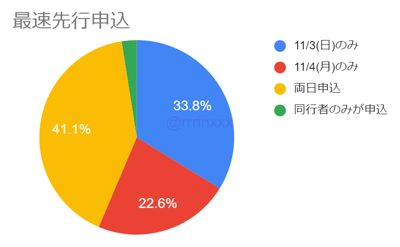 4割の方が両日申込でしたが、単日だと11/3(日)の方がやや人気が高い状況でした。