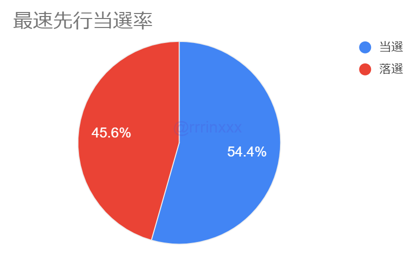全体の当選率は54.4%と「最速先行」としてはやや低めの結果でしたが、後述の通りFLIP THE CIRCLE(以後FTC)ツアーのこれまでの先行(大阪会場以外)の当選歴が影響しており、最速先行とはいえ大阪会場について別物扱いではなく、あくまで「FTCツアーのこれまでの先行に続くもの」であったようです。