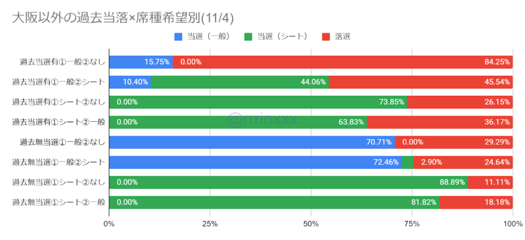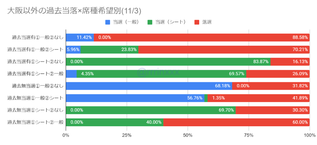※「過去無当選①シート②一般」(過去先行で当選歴がなく、第1希望がシートエリア、第2希望が一般エリア)は両日とも回答数が10件以内のため参考程度