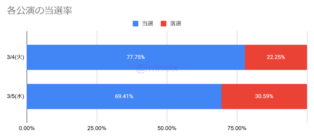 3/4(火)の当選率は77.75%、3/5(水)の当選率は69.41%と、申込の多い3/5(水)の方がやや当選率が下がる結果となりました。