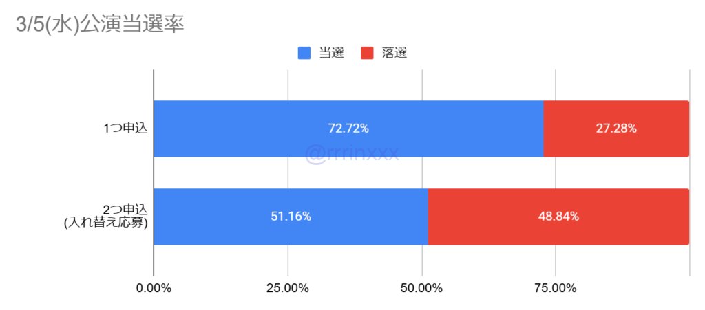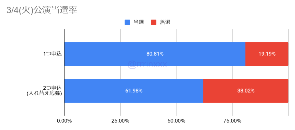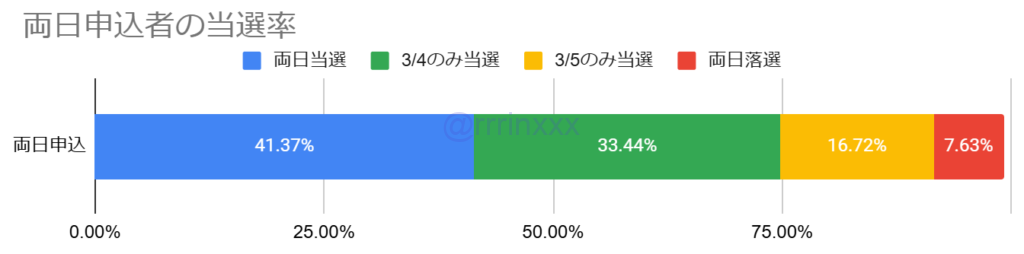 なお、両日申し込みした方の中で、両日とも当選した方は41.37%、両日とも落選した方は7.63%でした。両日とも当選した方が多数いるため、3/4に当選したら3/5の抽選からは除外されるというようなことはなく、それぞれの日付ごとに抽選されたものと推測します。