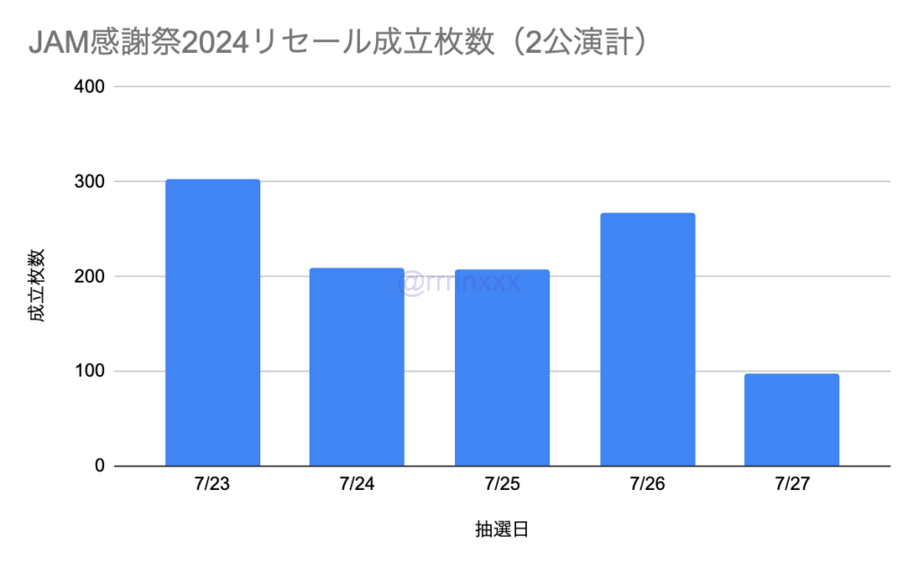 今回、リセールの開始は7/23と初日の4日前からで、抽選は計5回行われ、成立枚数は合計1085枚でした。