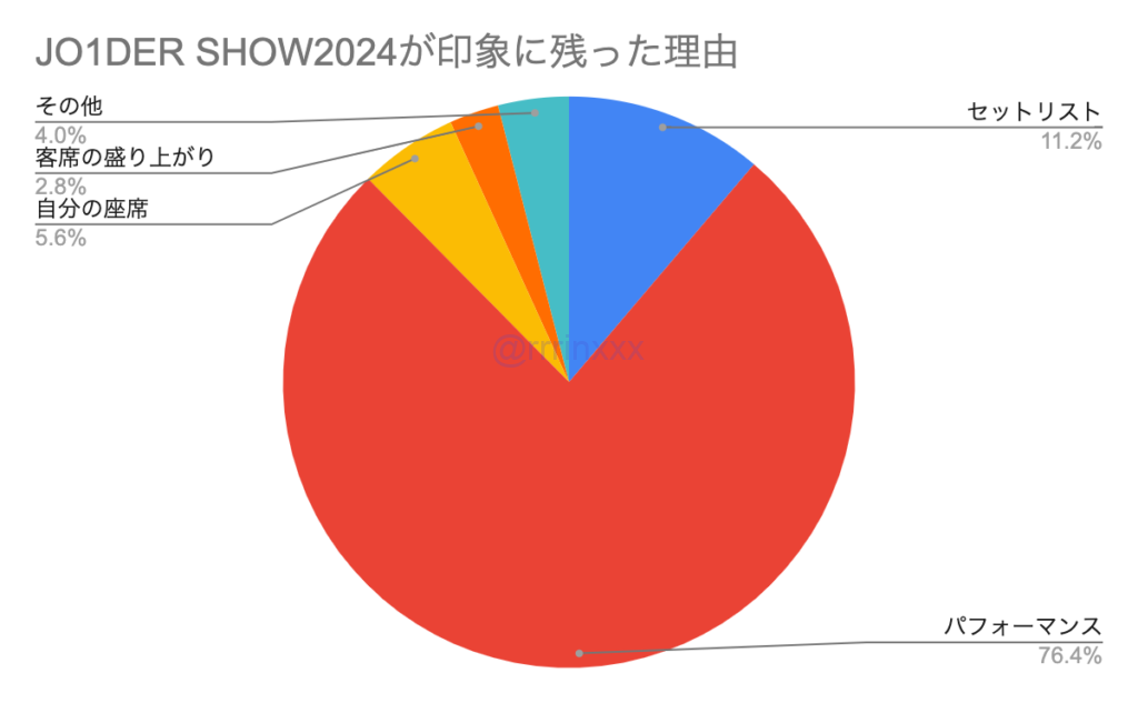JAM感謝祭が印象に残ったと挙げた方の理由は、パフォーマンスに加え、初めて近くで見られたなど、自分の座席がよかったことやセットリストの良さ、JO1からの手紙に感動したというさまざまな意見が見られました。