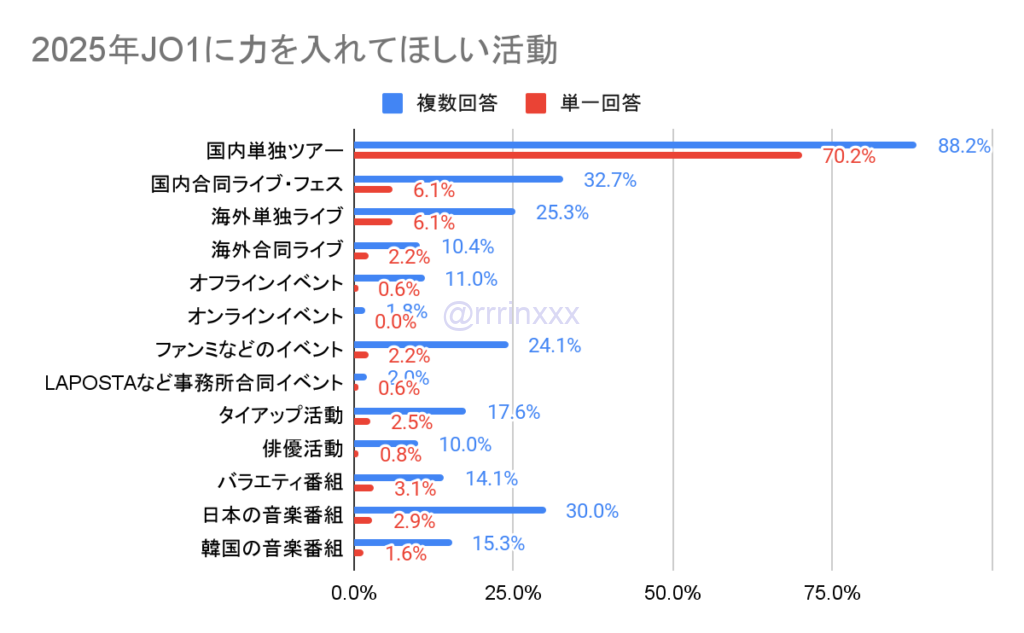 1位は複数回答・単一回答ともに国内単独ツアー、2位〜4位は複数回答・単一解答で入れ替わりますが、国内合同ライブ・フェス、海外単独ライブ、日本の音楽番組が高い結果となりました。昨年は1位は同じく国内単独ツアー、2位3位はファンミなどのイベント、音楽番組への出演でしたので、これと比べると、国内合同ライブ・フェスや海外単独ライブ(ワールドツアー)が上位に上がってきています。