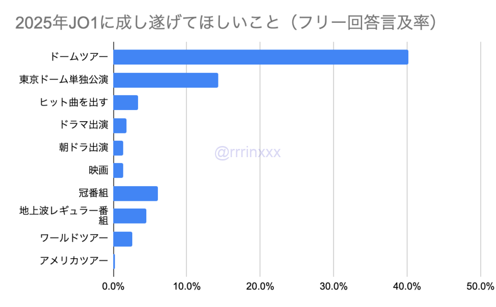 フリー回答でしたので、網羅はできていないのですが、特に多かった意見をまとめると下記グラフのようになりました。ドームツアーがダントツに多いなかでも、東京ドームでの単独公演を望む声が多く、早速これが叶うことはとても嬉しいですね!他にはヒット曲を生み出すこと、地上波でのレギュラー番組・冠番組を夢見る方が多くみられました。