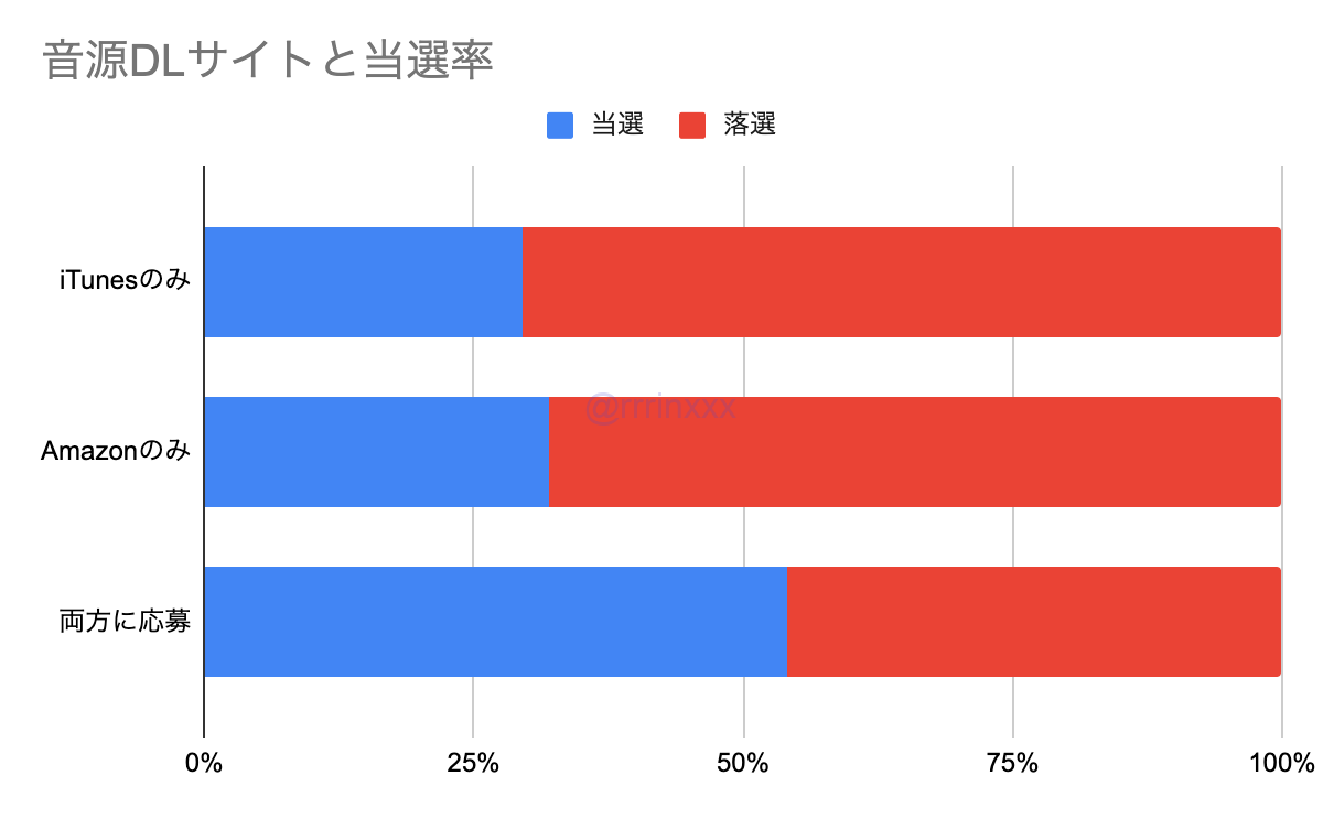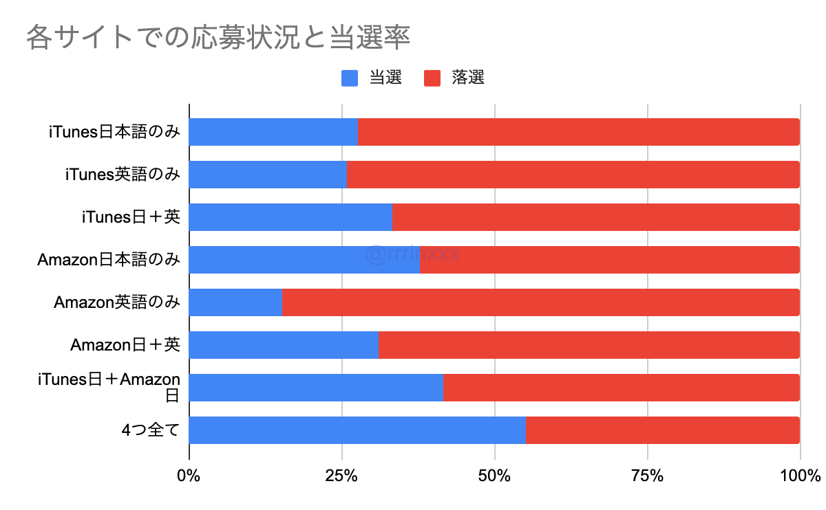 また、iTunesのみ、AmazonのみでDL応募した人よりも、両方で応募した人の当選率が高くなっていました。