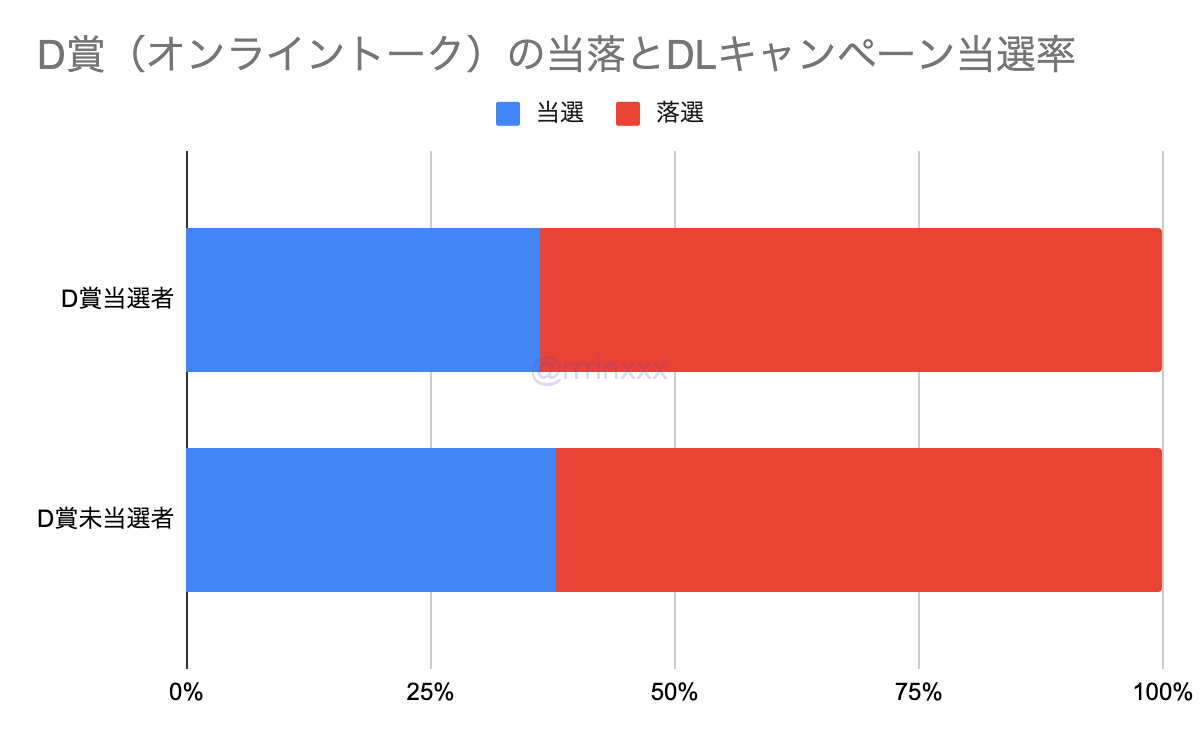 その中で、シリアルD賞(オンライントーク会)の当選者と未当選者(応募していない人も含む)の当選率を比較しても、ほとんど差はなかったことから、今回のDLキャンペーンでも、D賞(オンライントーク)の当選歴は影響していないものと結論づけます。