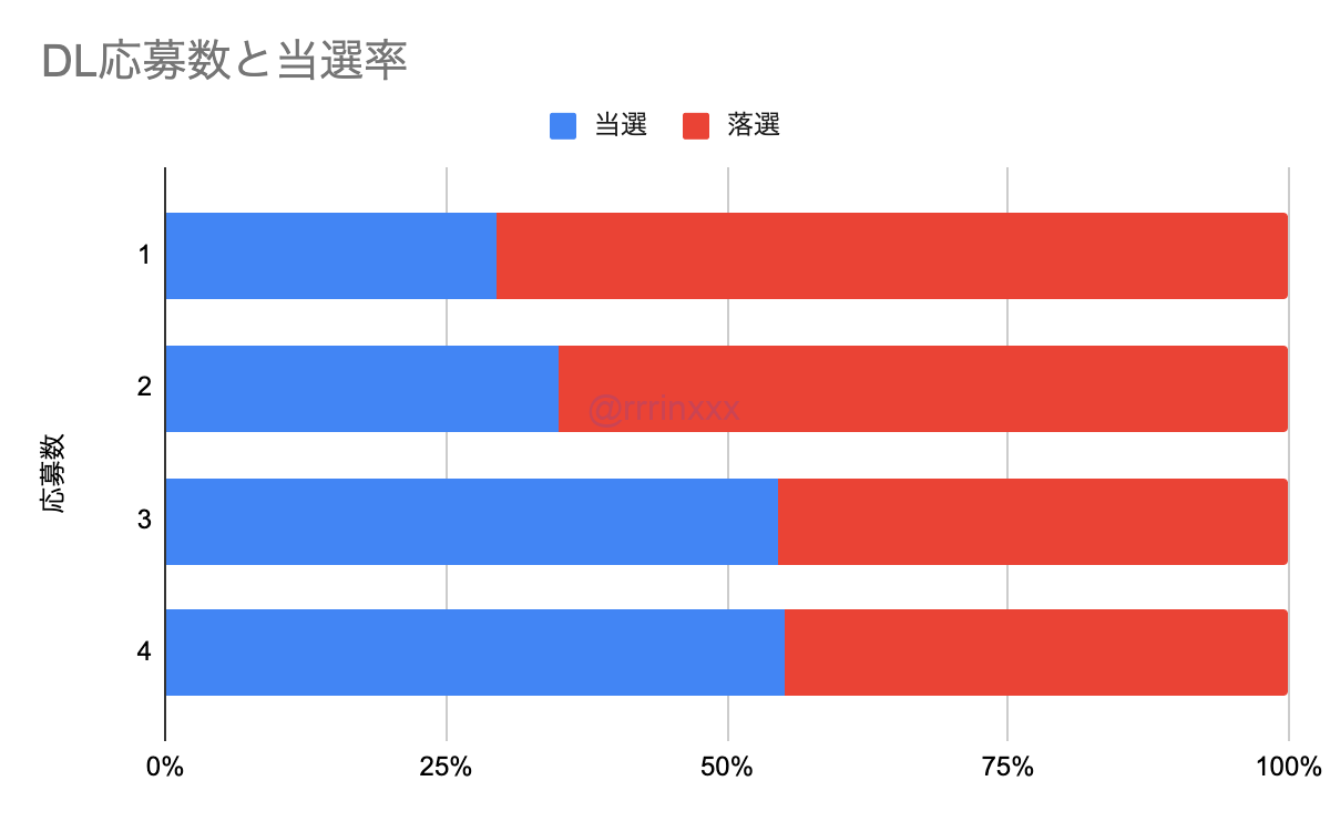 応募数は最大で4つでしたが、応募数が増えるほど当選率は増える傾向でした。