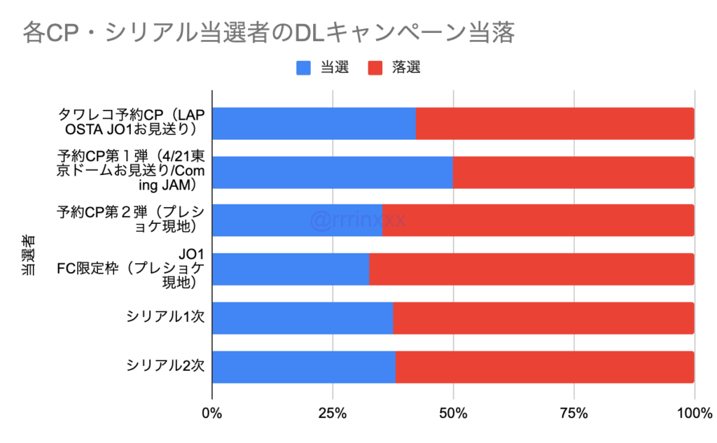 下記グラフは、1枚目が「それぞれのCP・シリアルの当選者」2枚目が「それぞれのCP・シリアルの落選者」の、今回のダウンロードキャンペーンの当選率を示したものです。