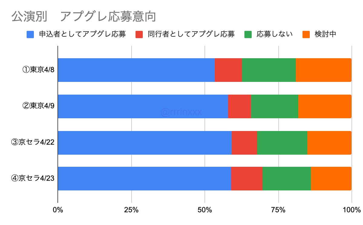 公演により大きくばらつきはありませんでしたが、後の日程の方がアプグレ意向がやや高い傾向にありました。