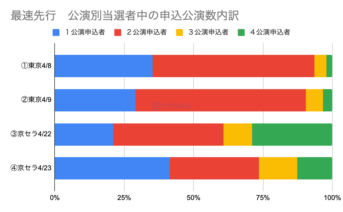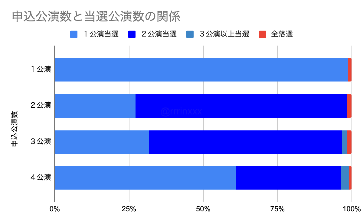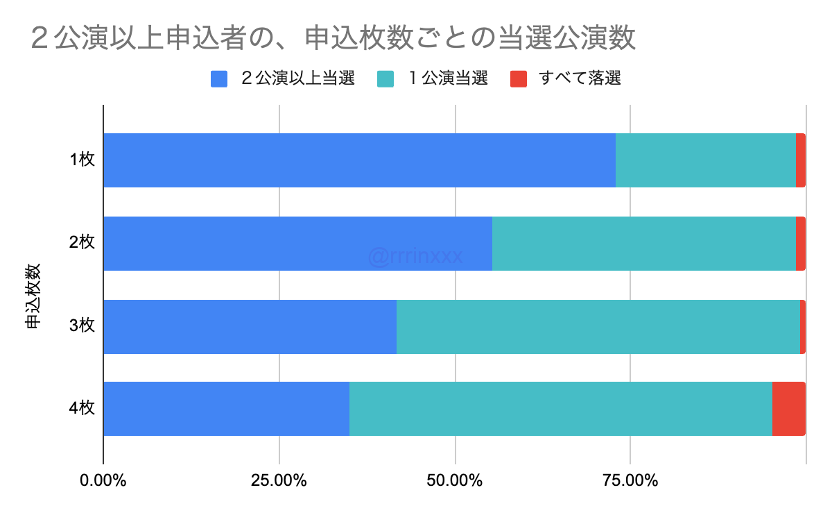 また、複数公演申込者についても、何公演申し込んでも基本的には2公演当選が上限となっておりましたが、なぜか4公演申込者よりも2公演もしくは3公演申込者の方が2公演当選者が多いという結果となっていました。