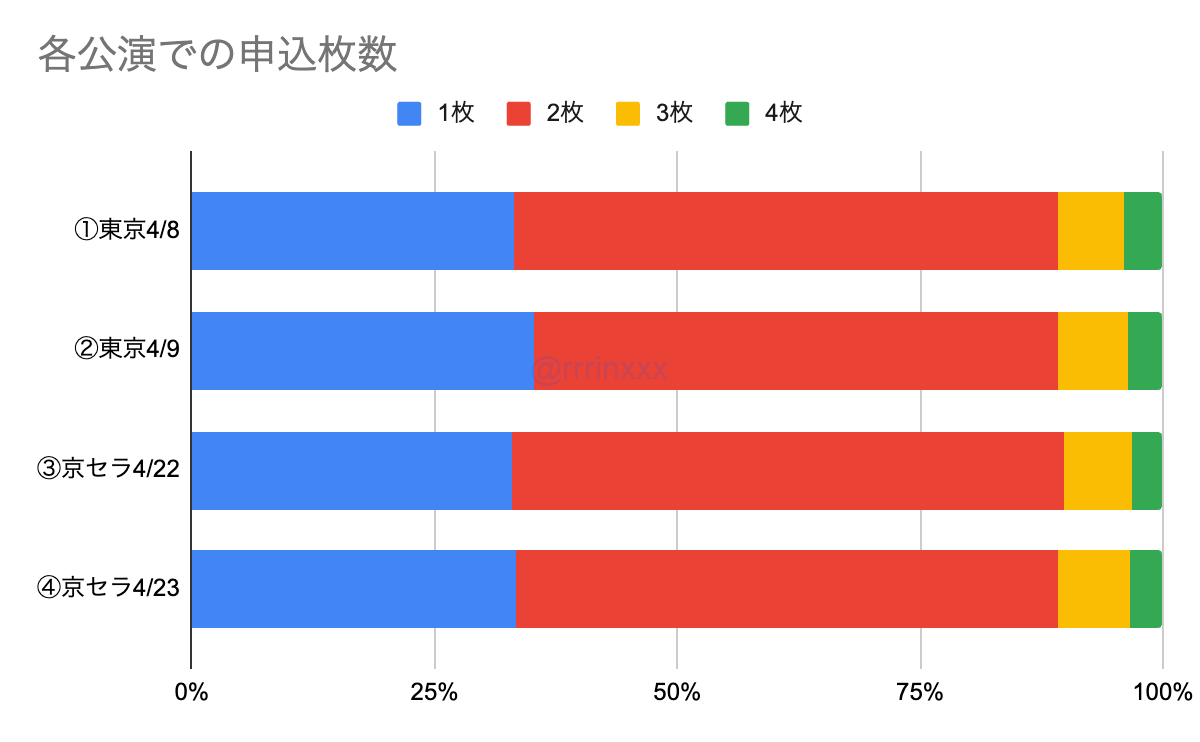 今回申込枚数は最大で4枚まで申し込みが可能でした。今回1公演はほぼ全員が当選している状況のため、申込枚数別に見ても、1公演以上当選率は変わりませんでした。