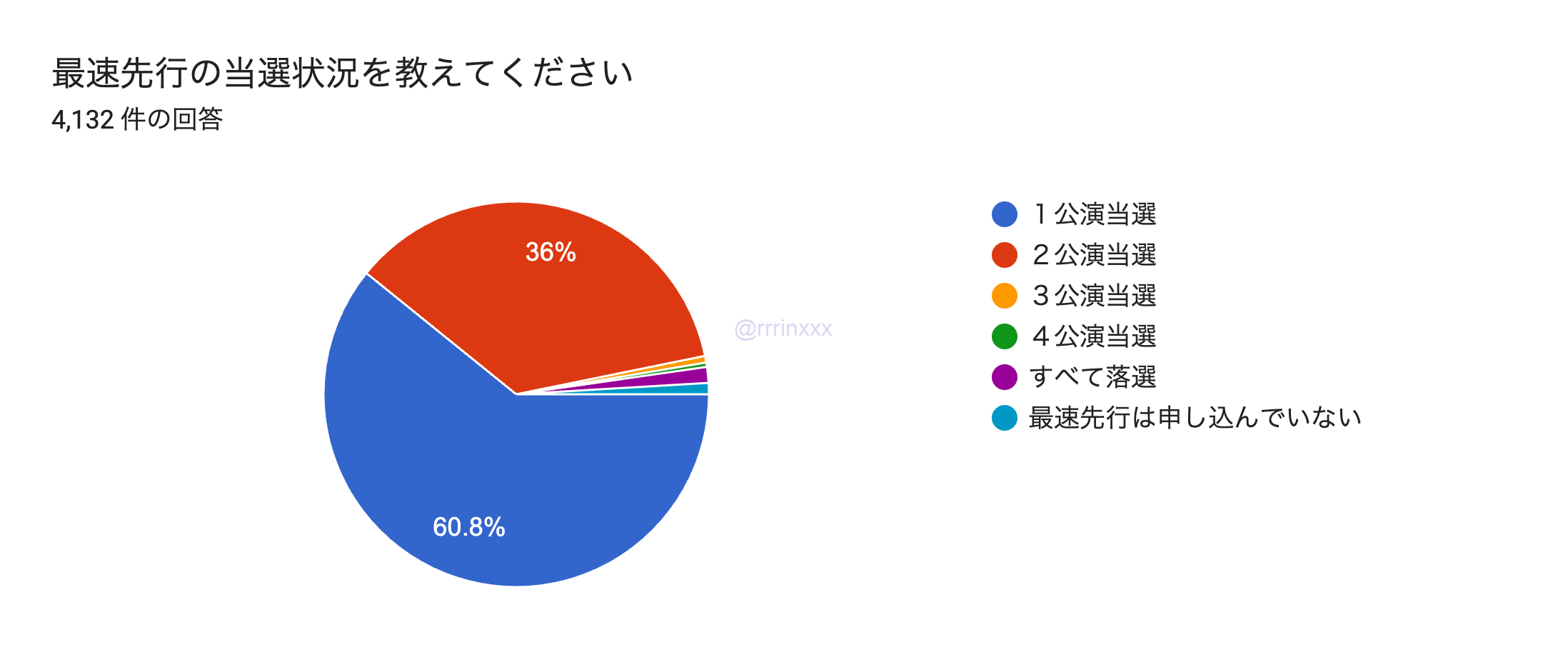 全体のうちでどのくらいの方がアンケートにお答えいただいているかがわからないので推測になりますが、最速先行としての各公演での当選枠は昨年よりもやや少ないと考えます。