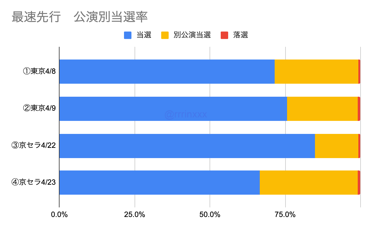 公演別の当選率を見ると、申込数の比較的少なかった③京セラ4/22が他公演と比べて当選率が高めとなっていました。