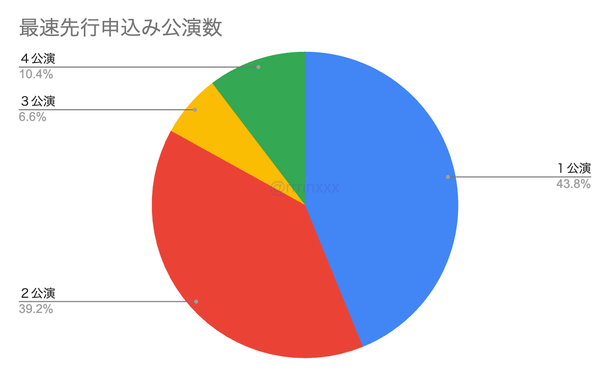 また、複数公演申込者についても、何公演申し込んでも基本的には2公演当選が上限となっておりましたが、なぜか4公演申込者よりも2公演もしくは3公演申込者の方が2公演当選者が多いという結果となっていました。