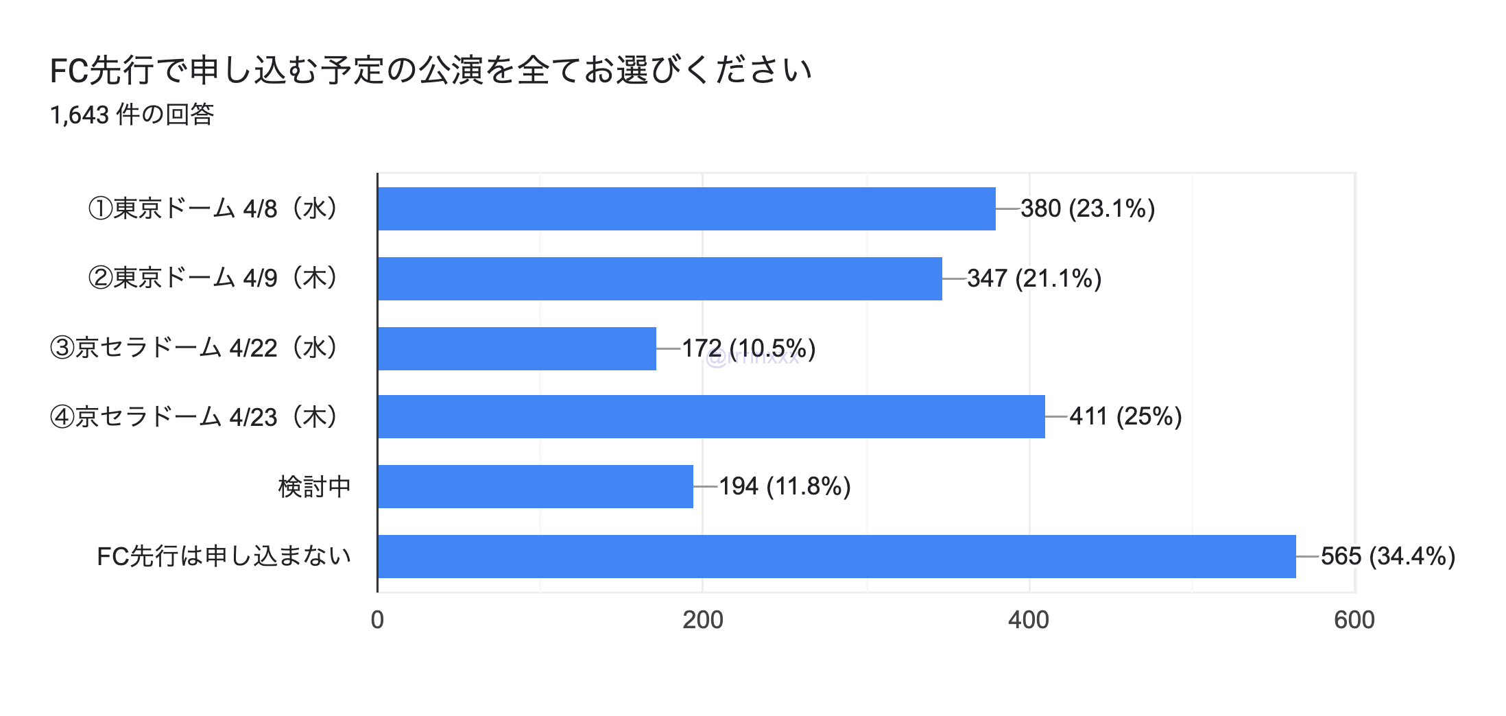 全体のうちでどのくらいの方がアンケートにお答えいただいているかがわからないので推測になりますが、最速先行としての各公演での当選枠は昨年よりもやや少ないと考えます。