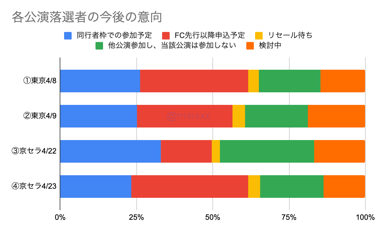 最速先行で今回各公演に落選した方向けに、今後の意向を尋ねたところ、FC先行の申込意向と同様、③京セラ4/22のFC先行申込予定が少なく、同行者枠での参加予定が多くなっていました。