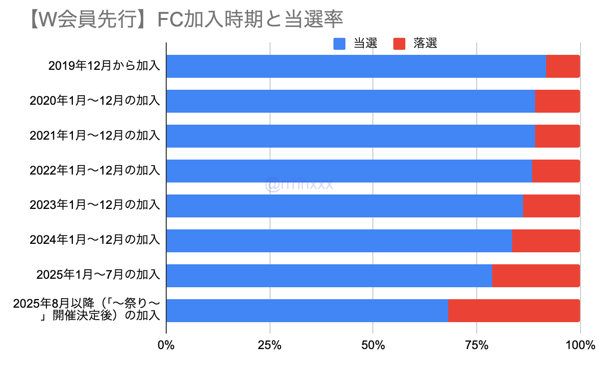 全体で見ると、FC加入時期が早い人ほどいずれかの公演に当選する確率が高くなっていました。