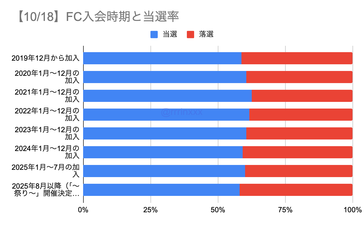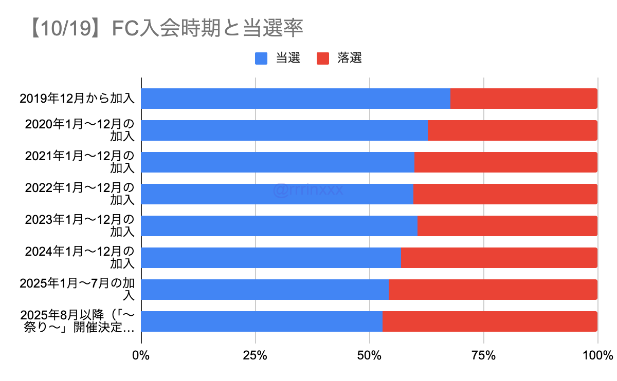 全体で見ると、FC加入時期が早い人ほどいずれかの公演に当選する確率が高くなっていました。