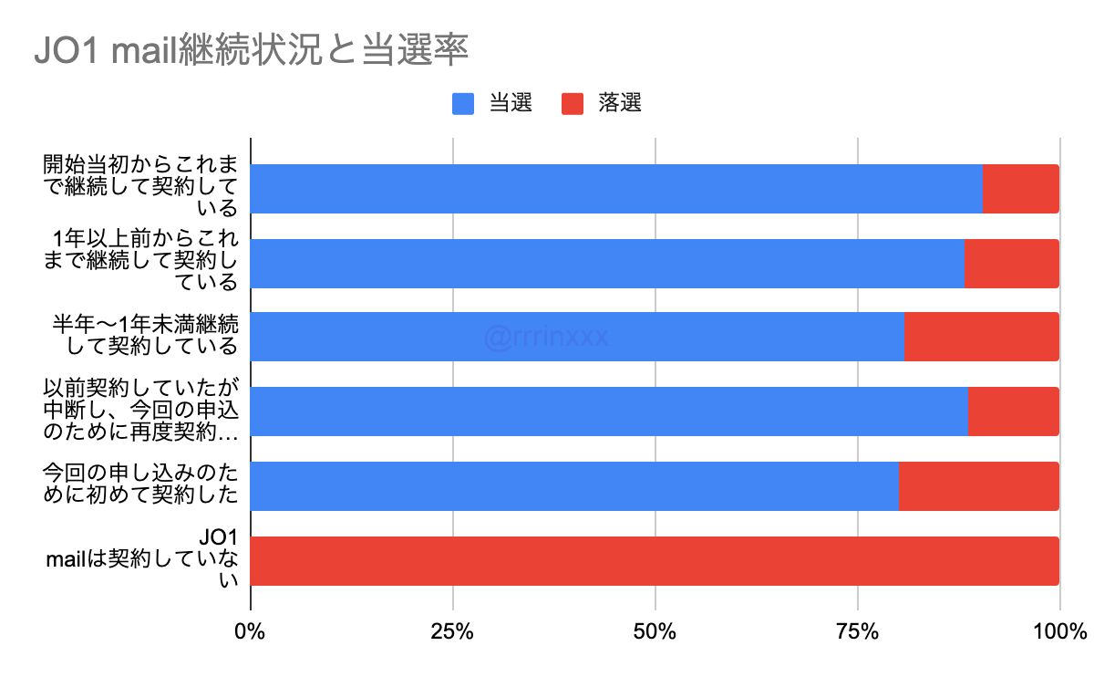 また、JO1 mailの登録人数や、継続状況は当選率に影響はありませんでした。