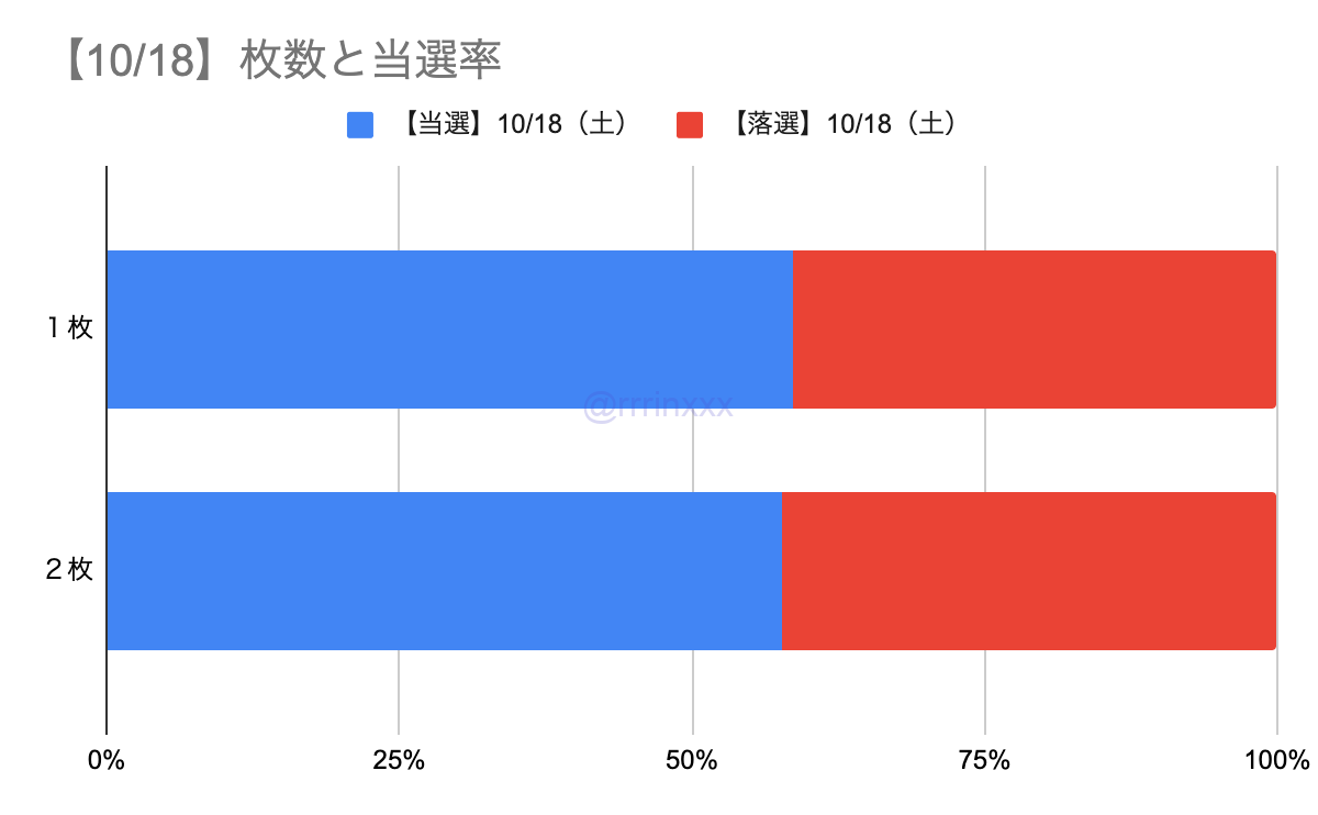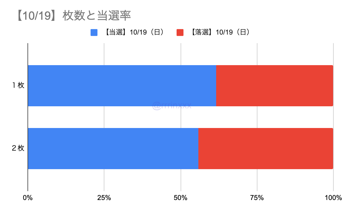 10/19公演でやや1枚の方が当たりやすい傾向にはあったものの、全体で見ると枚数による当選率への影響はほとんどありませんでした。