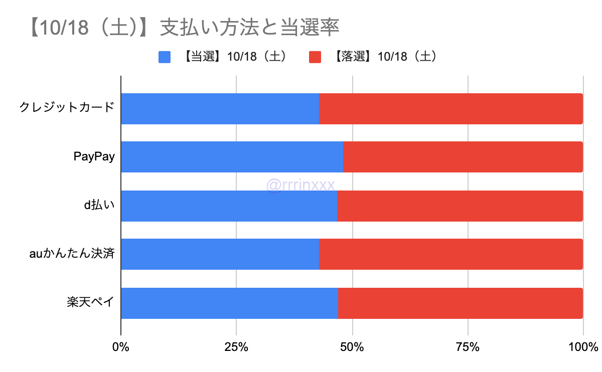 今回、決済方法がクレジットカード・Paypay・楽天ペイ・キャリア決済等が使用できましたが、決済方法による当選率の差はほとんどありませんでした。
