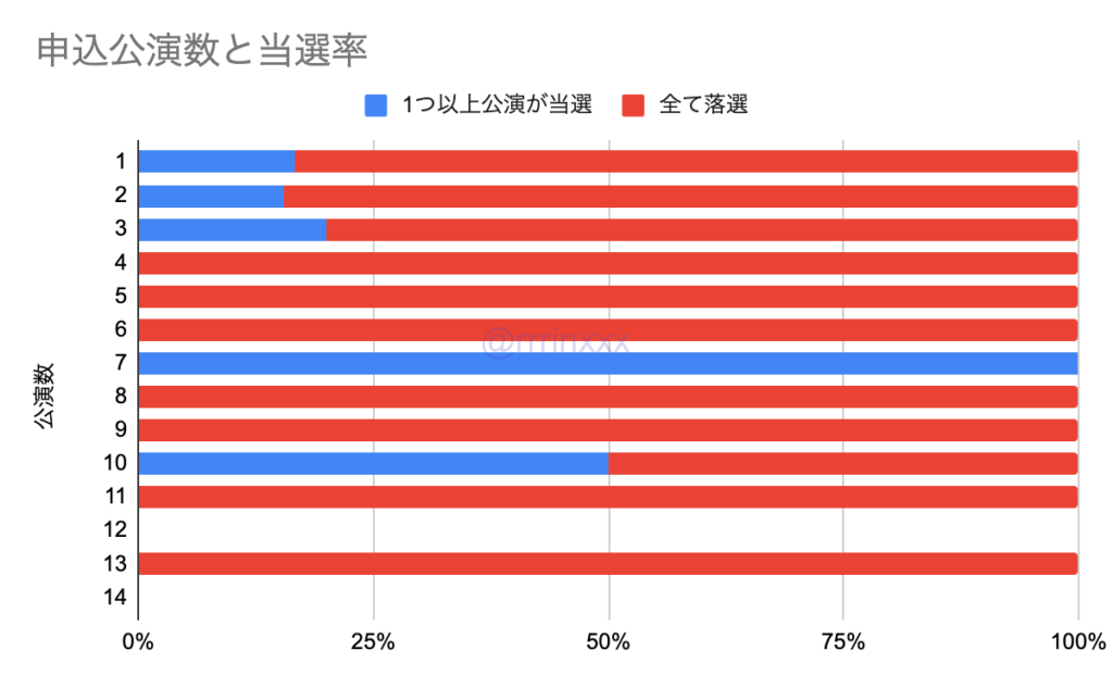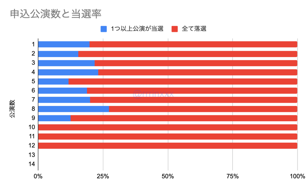 報告数が少ないため参考値になりますが、申込公演数が増えても当たりやすくなる傾向はありませんでした。