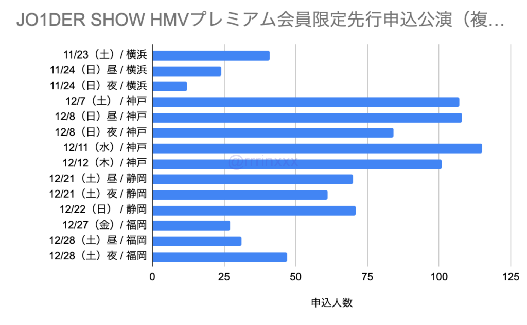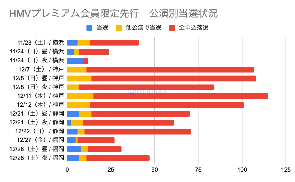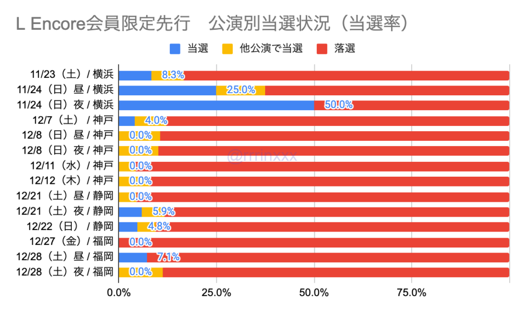当選率を見ると、最も当選率が高かったのは横浜11/24夜の75%、最も当選率が低かったのは神戸全公演の0%でした。