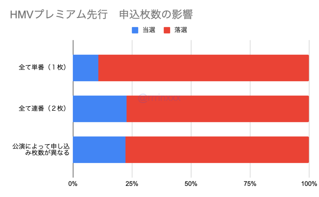 HMVプレミアム先行では、単番申し込みよりも連番申込を含めた方が当選率が高い傾向となりました。